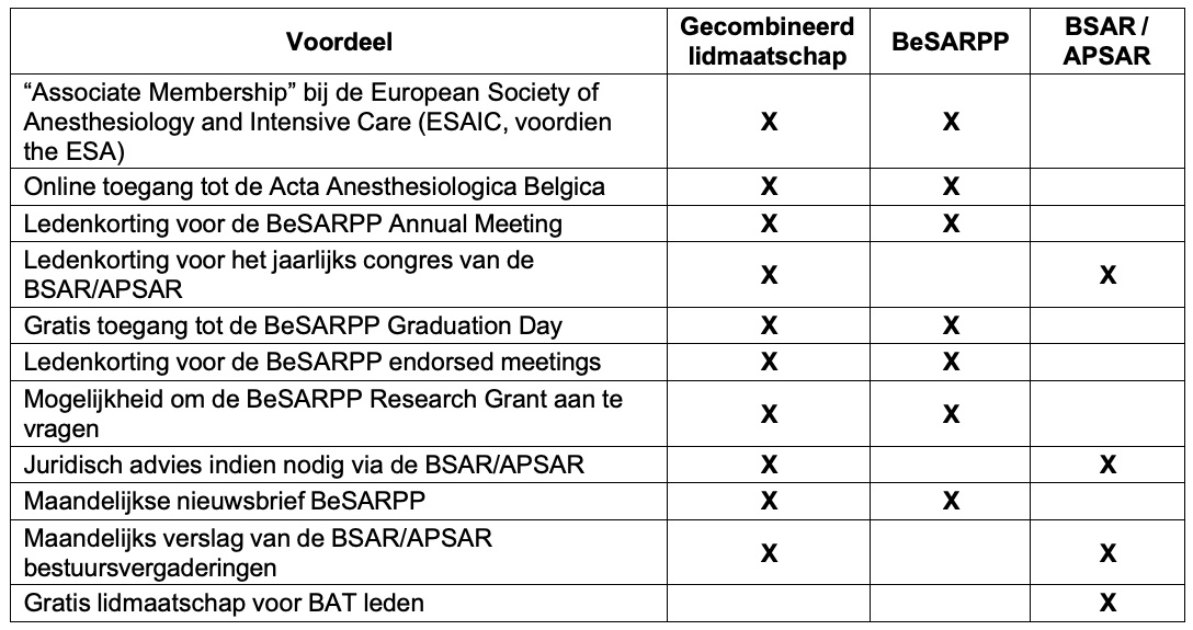 In 2026 is het opnieuw mogelijk om lid te worden van de beroepsvereniging BSAR-APSAR (Beroepsvereniging van Specialisten in Anesthesie Reanimatie - Association Professionelle des Spécialistes en Anesthésie Réanimation) en de wetenschappelijke vereniging BeSARPP (Belgian Society of Anesthesiology, Resuscitation, Perioperative medicine and Pain management).